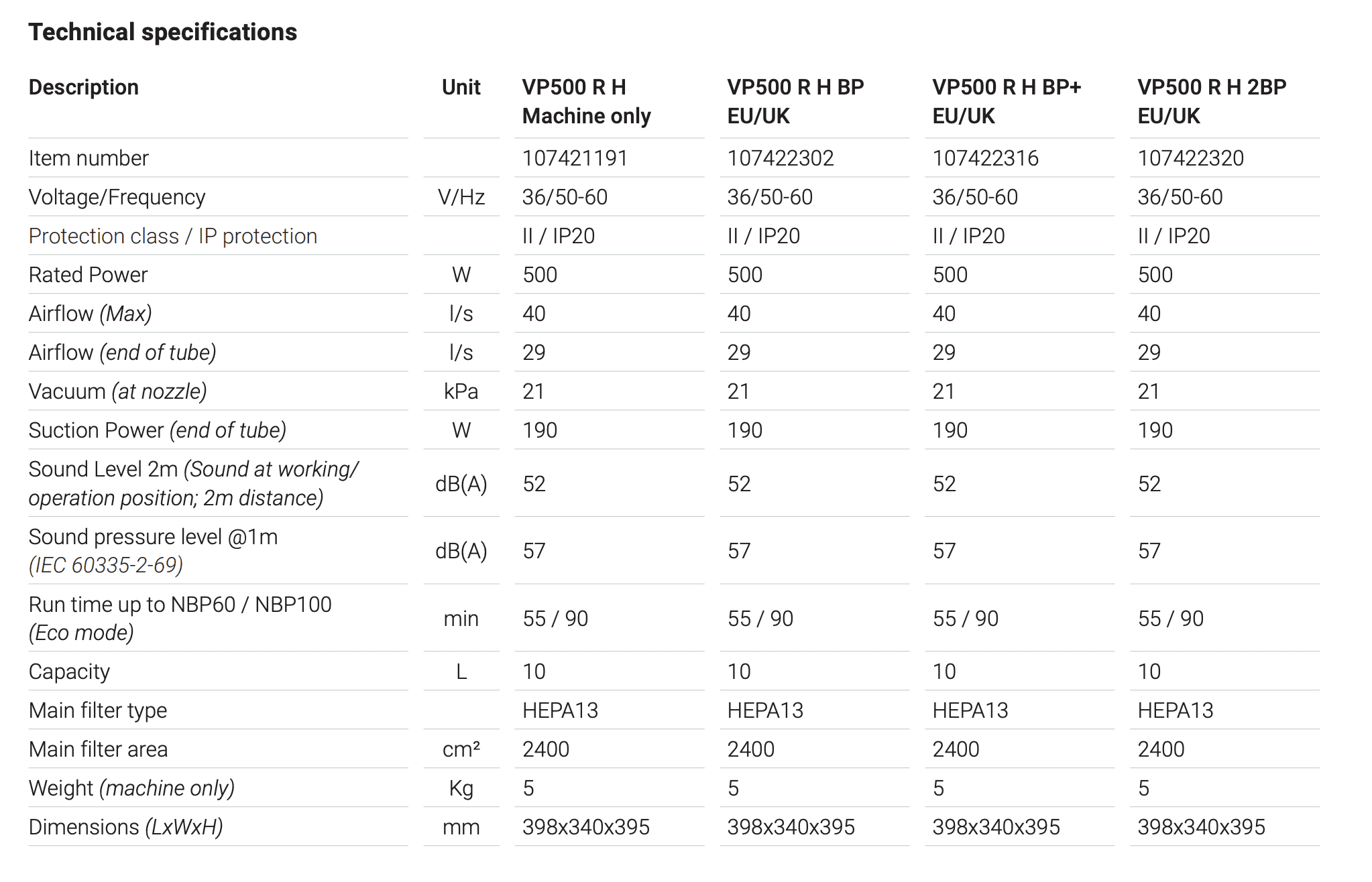 VP500 technical spec